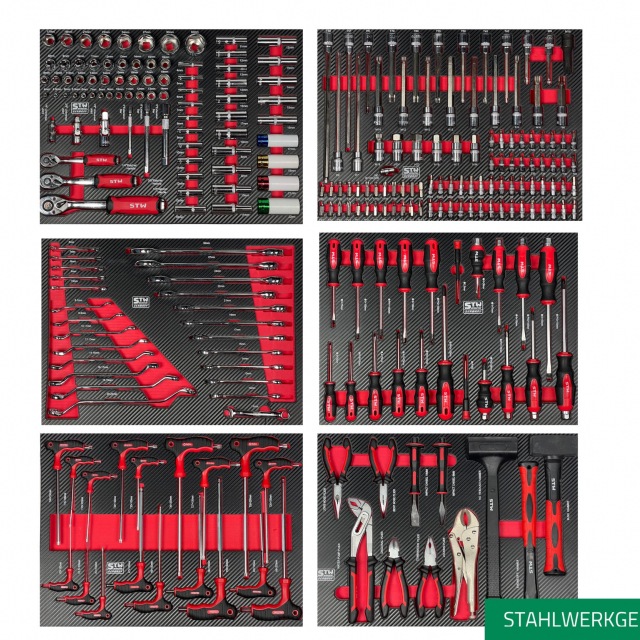 Deze STWXL werkplaatswagen heeft 7 kogelgelagerde laden, waarvan 6 gevuld met 295-delig gereedschap.